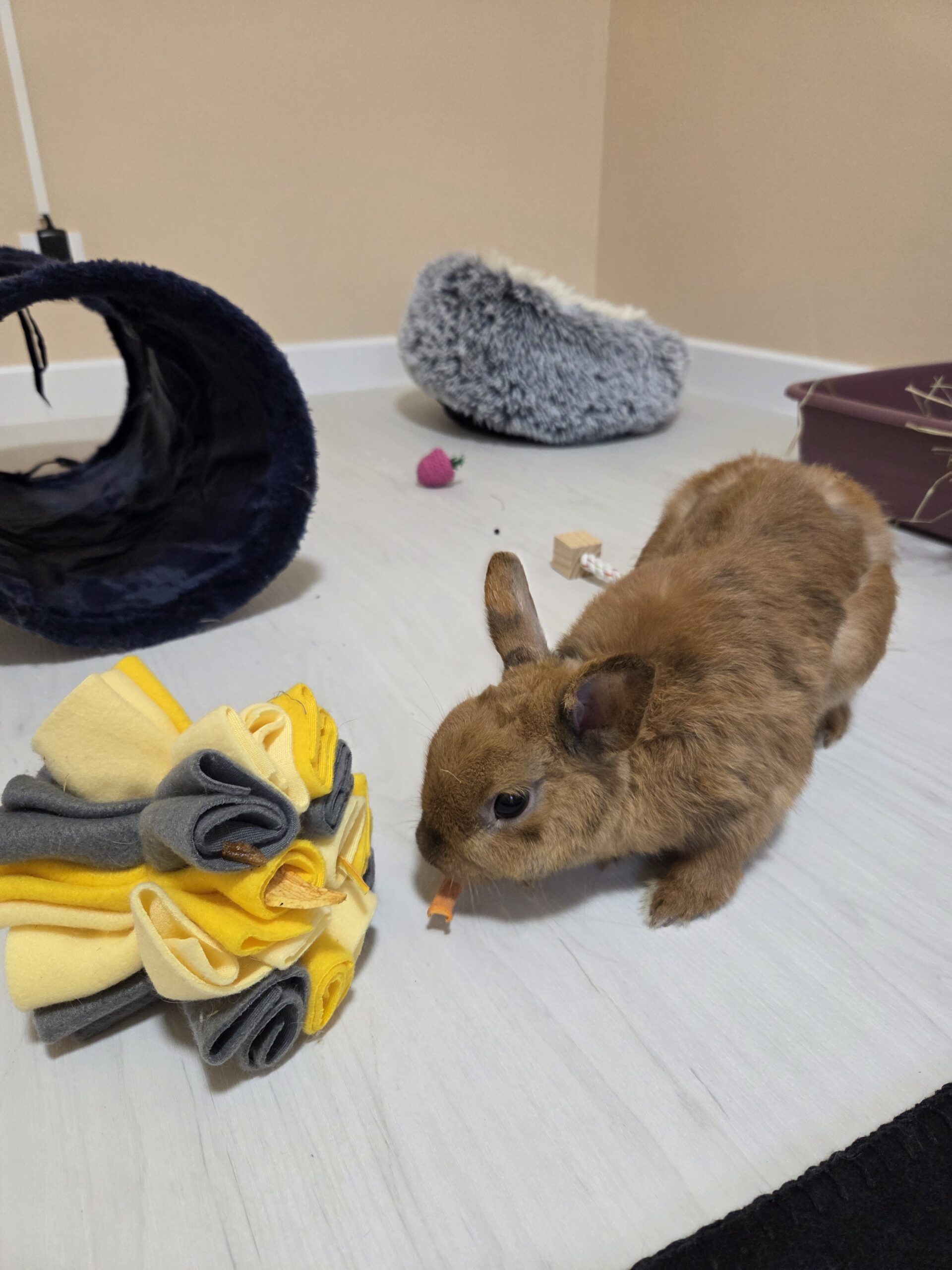 Vous pouvez bien-sûr y apporter les affaires de votre lapin afin qu’il garde des repères : cabane, plaid, doudou, tapis… ce que vous souhaitez.