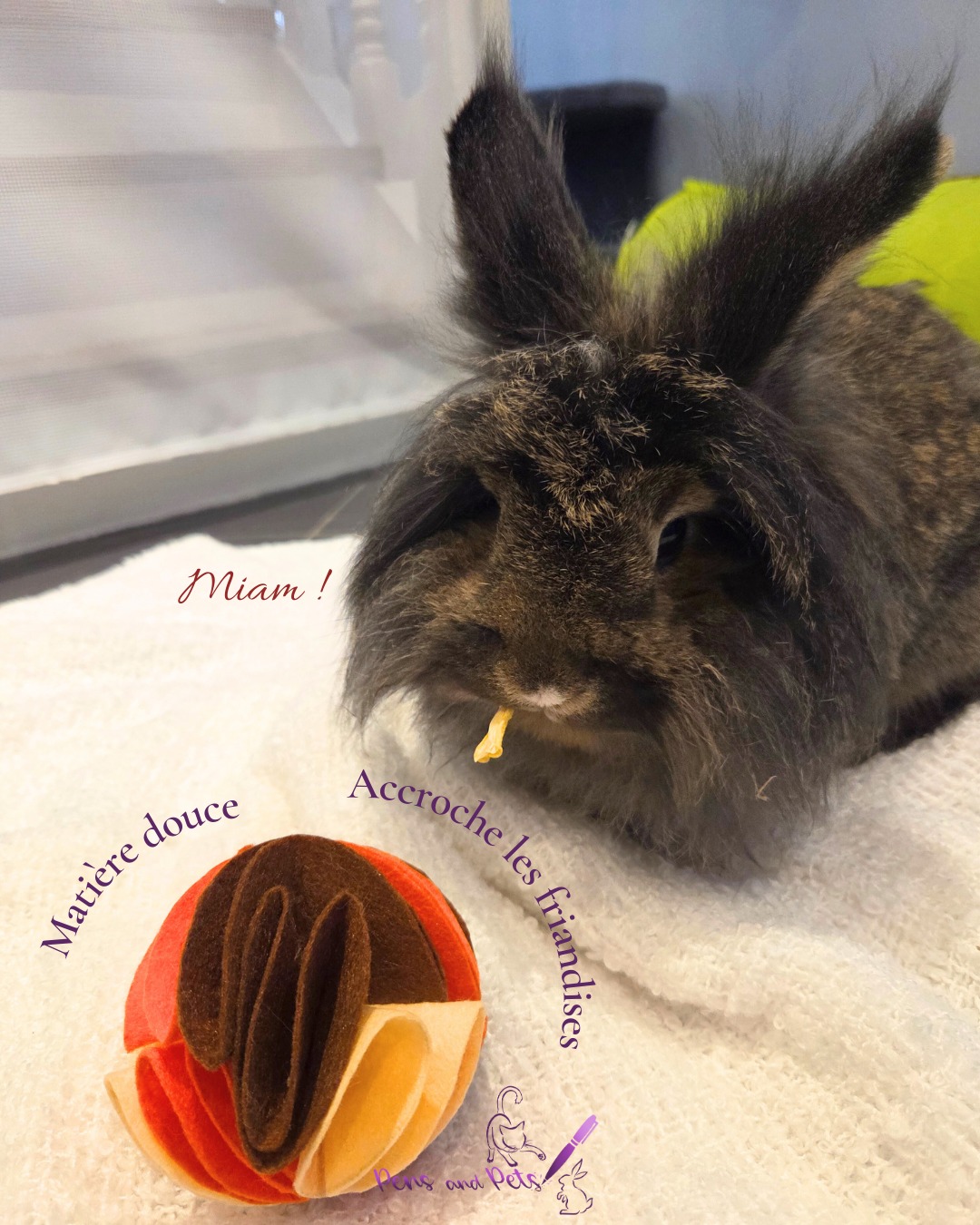 Le principe est très simple : il suffit de glisser quelques friandises / croquettes dans les balles et de laisser votre compagnon fouiller. La feutrine accroche la nourriture, ce qui permet de complexifier l’interaction, en effet la faire rouler ne suffira pas à faire tomber toutes les friandises, il faudra aussi que votre animal glisse sa patte ou son museau afin d’attraper les gourmandises !